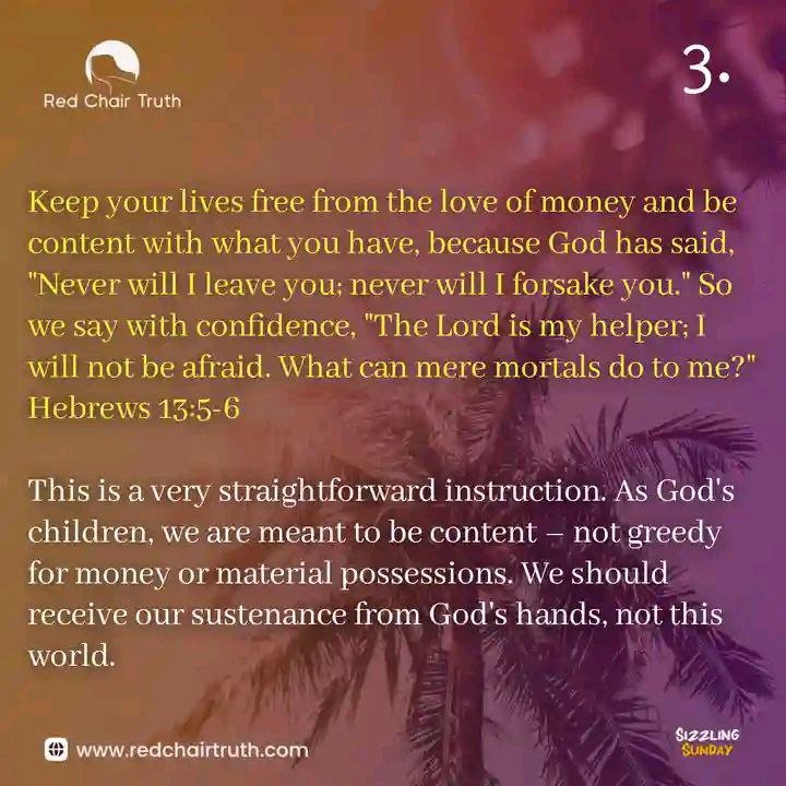 This is a very straightforward instruction. As God’s children, we are meant to be content – not greedy for money or material possessions. We should receive our sustenance from God’s hands, not this world. You may say, “But how? God won’t come down from heaven and buy me breakfast or pay my bills, will He? We live in this world – not in the clouds!”