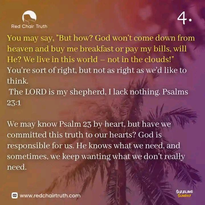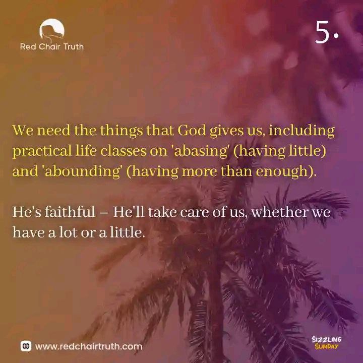 We may know Psalm 23 by heart, but have we committed this truth to our hearts? God is responsible for us. He knows what we need, and sometimes, we keep wanting what we don’t really need. We need the things that God gives us, including practical life classes on ‘abasing’ (having little) and ‘abounding’ (having more than enough).