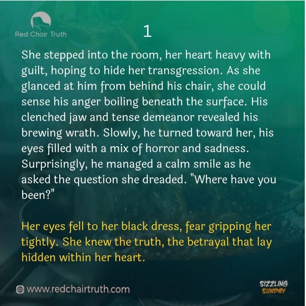 She stepped into the room, her heart heavy with guilt, hoping to hide her transgression. As she glanced at him from behind his chair, she could sense his anger boiling beneath the surface. His clenched jaw and tense demeanor revealed his brewing wrath. Slowly, he turned toward her, his eyes filled with a mix of horror and sadness. Surprisingly, he managed a calm smile as he asked the question she dreaded. “Where have you been?” Her eyes fell to her black dress, fear gripping her tightly. She knew the truth, the betrayal that lay hidden within her heart.