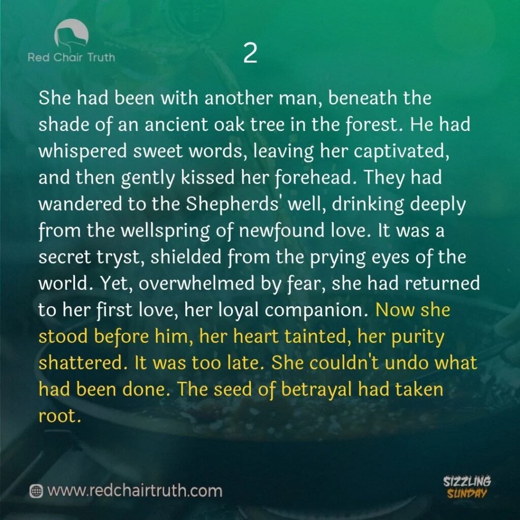 She had been with another man, beneath the shade of an ancient oak tree in the forest. He had whispered sweet words, leaving her captivated, and then gently kissed her forehead. They had wandered to the Shepherds’ well, drinking deeply from the wellspring of newfound love. It was a secret tryst, shielded from the prying eyes of the world. Yet, overwhelmed by fear, she had returned to her first love, her loyal companion. Now she stood before him, her heart tainted, her purity shattered. It was too late. She couldn’t undo what had been done. The seed of betrayal had taken root.
