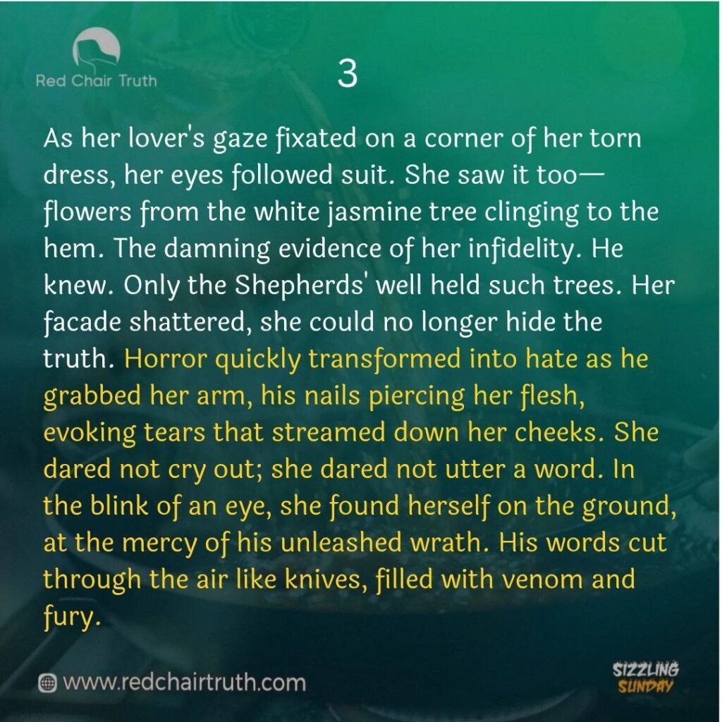 As her lover’s gaze fixated on a corner of her torn dress, her eyes followed suit. She saw it too- flowers from the white jasmine tree clinging to the hem. The damning evidence of her infidelity. He knew. Only the Shepherds’ well held such trees. Her facade shattered, she could no longer hide the truth. Horror quickly transformed into hate as he grabbed her arm, his nails piercing her flesh, evoking tears that streamed down her cheeks. She dared not cry out; she dared not utter a word. In the blink of an eye, she found herself on the ground, at the mercy of his unleashed wrath. His words cut through the air like knives, filled with venom and fury.