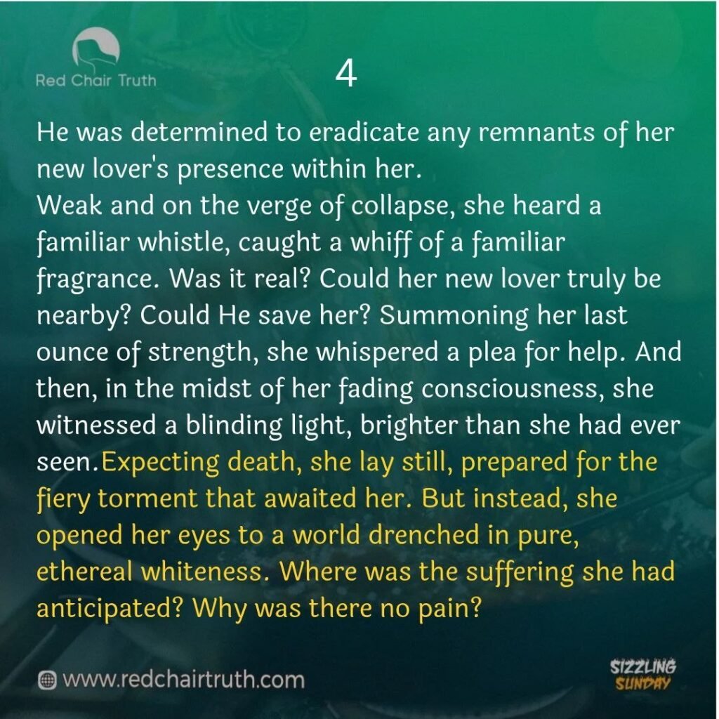 He was determined to eradicate any remnants of her new lover’s presence within her. Weak and on the verge of collapse, she heard a familiar whistle, caught a whiff of a familiar fragrance. Was it real? Could her new lover truly be nearby? Could He save her? Summoning her last ounce of strength, she whispered a plea for help. And then, in the midst of her fading consciousness, she witnessed a blinding light, brighter than she had ever seen. Expecting death, she lay still, prepared for the fiery torment that awaited her. But instead, she opened her eyes to a world drenched in pure, ethereal whiteness. Where was the suffering she had anticipated? Why was there no pain?