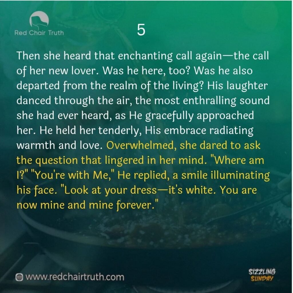 Then she heard that enchanting call again-the call of her new lover. Was he here, too? Was he also departed from the realm of the living? His laughter danced through the air, the most enthralling sound she had ever heard, as He gracefully approached her. He held her tenderly, His embrace radiating warmth and love. Overwhelmed, she dared to ask the question that lingered in her mind. “Where am I?” “You’re with Me,” He replied, a smile illuminating his face. “Look at your dress-it’s white. You are now mine and mine forever.”