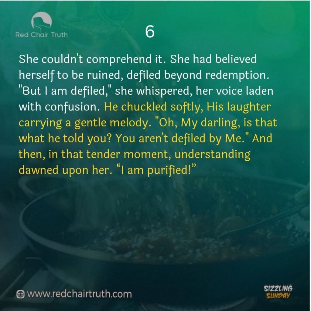 She couldn’t comprehend it. She had believed herself to be ruined, defiled beyond redemption. “But I am defiled,” she whispered, her voice laden with confusion. He chuckled softly, His laughter carrying a gentle melody. “Oh, my darling, is that what he told you? You aren’t defiled by Me.” And then, in that tender moment, understanding dawned upon her. “I am purified!“