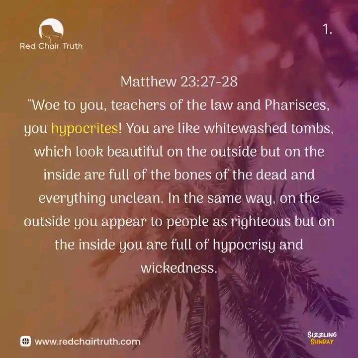 "Woe to you, teachers of the law and Pharisees, you hypocrites! You are like whitewashed tombs, which look beautiful on the outside but on the inside are full of the bones of the dead and everything unclean. In the same way, on the outside you appear to people as righteous but on the inside you are full of hypocrisy and wickedness. Matthew 23:27-28