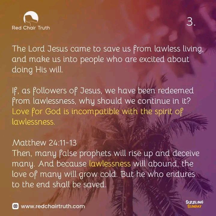 The Lord Jesus came to save us from lawless living, and make us into people who are excited about doing His will. If, as followers of Jesus, we have been redeemed from lawlessness, why should we continue in it? Love for God is incompatible with the spirit of lawlessness.