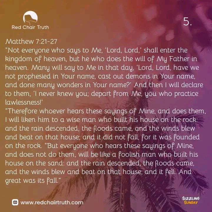 “Not everyone who says to Me, ‘Lord, Lord,’ shall enter the kingdom of heaven, but he who does the will of My Father in heaven. Many will say to Me in that day, ‘Lord, Lord, have we not prophesied in Your name, cast out demons in Your name, and done many wonders in Your name?’ And then I will declare to them, ‘I never knew you; depart from Me, you who practice lawlessness!’