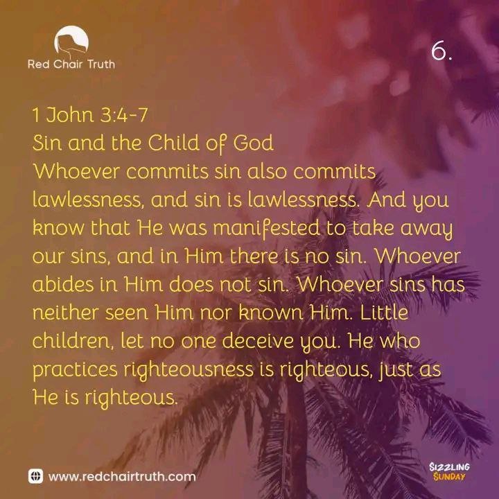 Whoever commits sin also commits lawlessness, and sin is lawlessness. And you know that He was manifested to take away our sins, and in Him there is no sin. Whoever abides in Him does not sin. Whoever sins has neither seen Him nor known Him. Little children, let no one deceive you. He who practices righteousness is righteous, just as He is righteous.