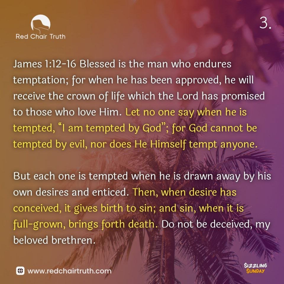 Blessed is the man who endures temptation; for when he has been approved, he will receive the crown of life which the Lord has promised to those who love Him. Let no one say when he is tempted, “I am tempted by God”; for God cannot be tempted by evil, nor does He Himself tempt anyone. But each one is tempted when he is drawn away by his own desires and enticed. Then, when desire has conceived, it gives birth to sin; and sin, when it is full-grown, brings forth death. Do not be deceived, my beloved brethren.