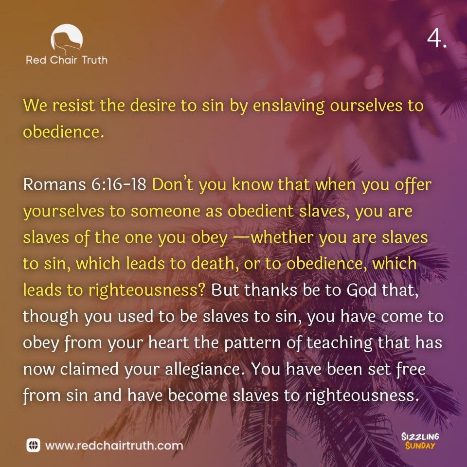 Don’t you know that when you offer yourselves to someone as obedient slaves, you are slaves of the one you obey -—whether you are slaves to sin, which leads to death, or to obedience, which leads to righteousness? But thanks be to God that, though you used to be slaves to sin, you have come to obey from your heart the pattern of teaching that has now claimed your allegiance. You have been set free from sin and have become slaves to righteousness.