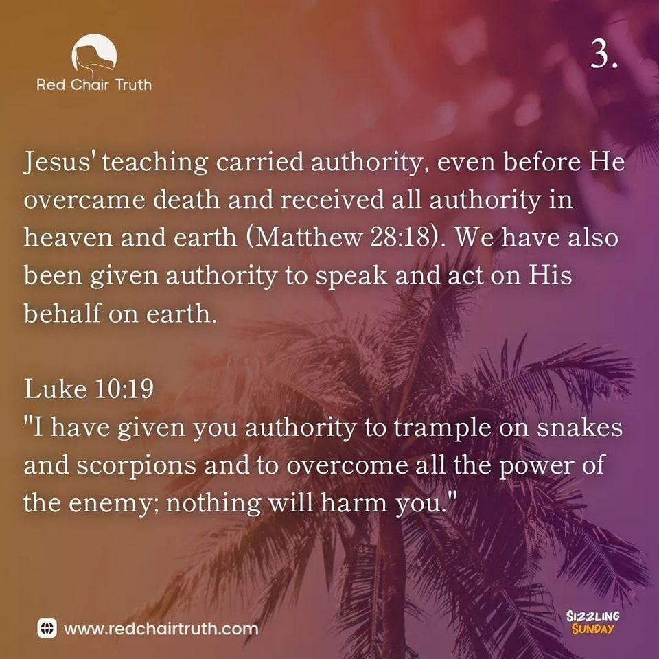 Jesus’ teaching carried authority, even before He overcame death and received all authority in heaven and earth (Matthew 28:18). We have also been given authority to speak and act on His behalf on earth.