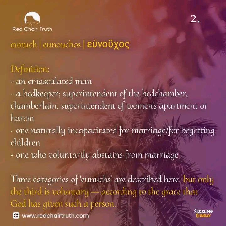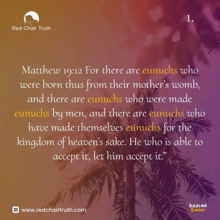 "For there are eunuchs who were born thus from their mother's womb, and there are eunuchs who were made eunuchs by men, and there are eunuchs who have made themselves eunuchs for the kingdom of heaven's sake. He who is able to accept it, let him accept it.” Matthew 19:12