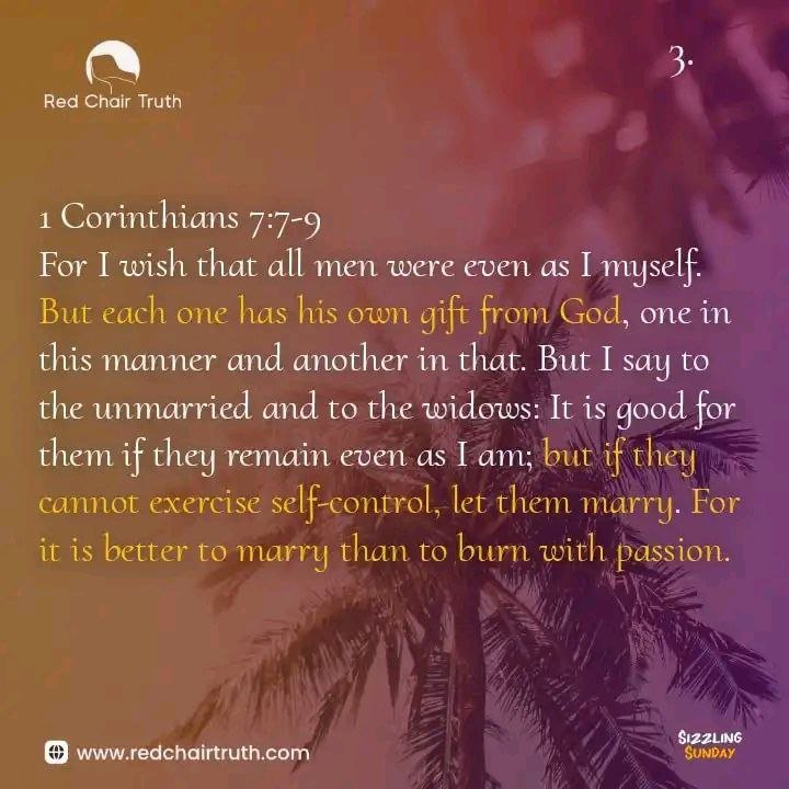 For I wish that all men were even as I myself. But each one has his own gift from God, one in this manner and another in that. But I say to the unmarried and to the widows: It is good for them if they remain even as I am; but if they cannot exercise self-control, let them marry. For it is better to marry than to burn with passion.