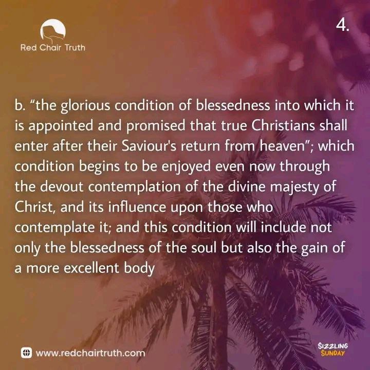 b. “the glorious condition of blessedness into which it is appointed and promised that true Christians shall enter after their Saviour’s return from heaven”; which condition begins to be enjoyed even now through the devout contemplation of the divine majesty of Christ, and its influence upon those who contemplate it; and this condition will include not only the blessedness of the soul but also the gain of a more excellent body.