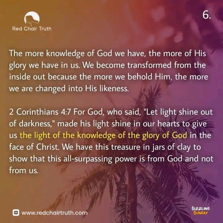 The more knowledge of God we have, the more of His glory we have in us. We become transformed from the inside out because the more we behold Him, the more we are changed into His likeness.