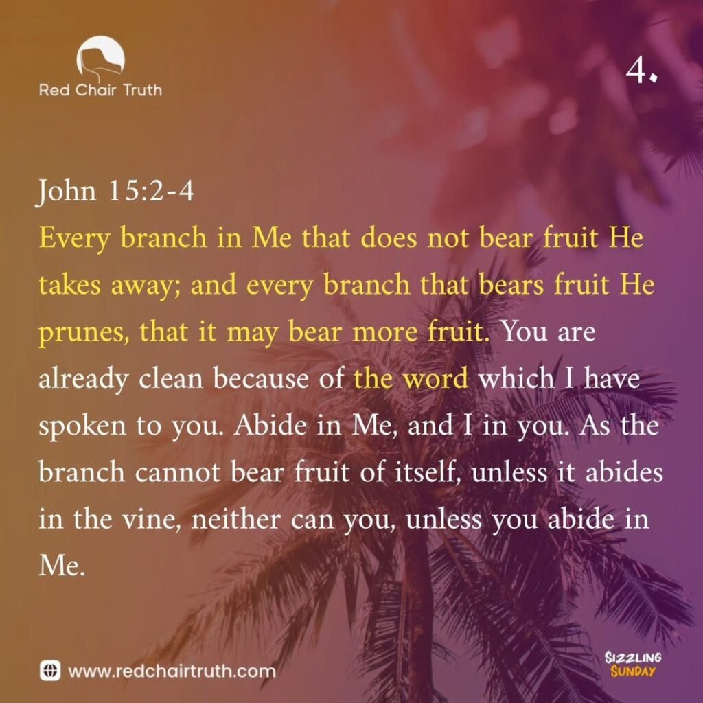 Every branch in Me that does not bear fruit He takes away; and every branch that bears fruit He prunes, that it may bear more fruit. You are already clean because of the word which I have spoken to you. Abide in Me, and I in you. As the branch cannot bear fruit of itself, unless it abides in the vine, neither can you, unless you abide in Me.