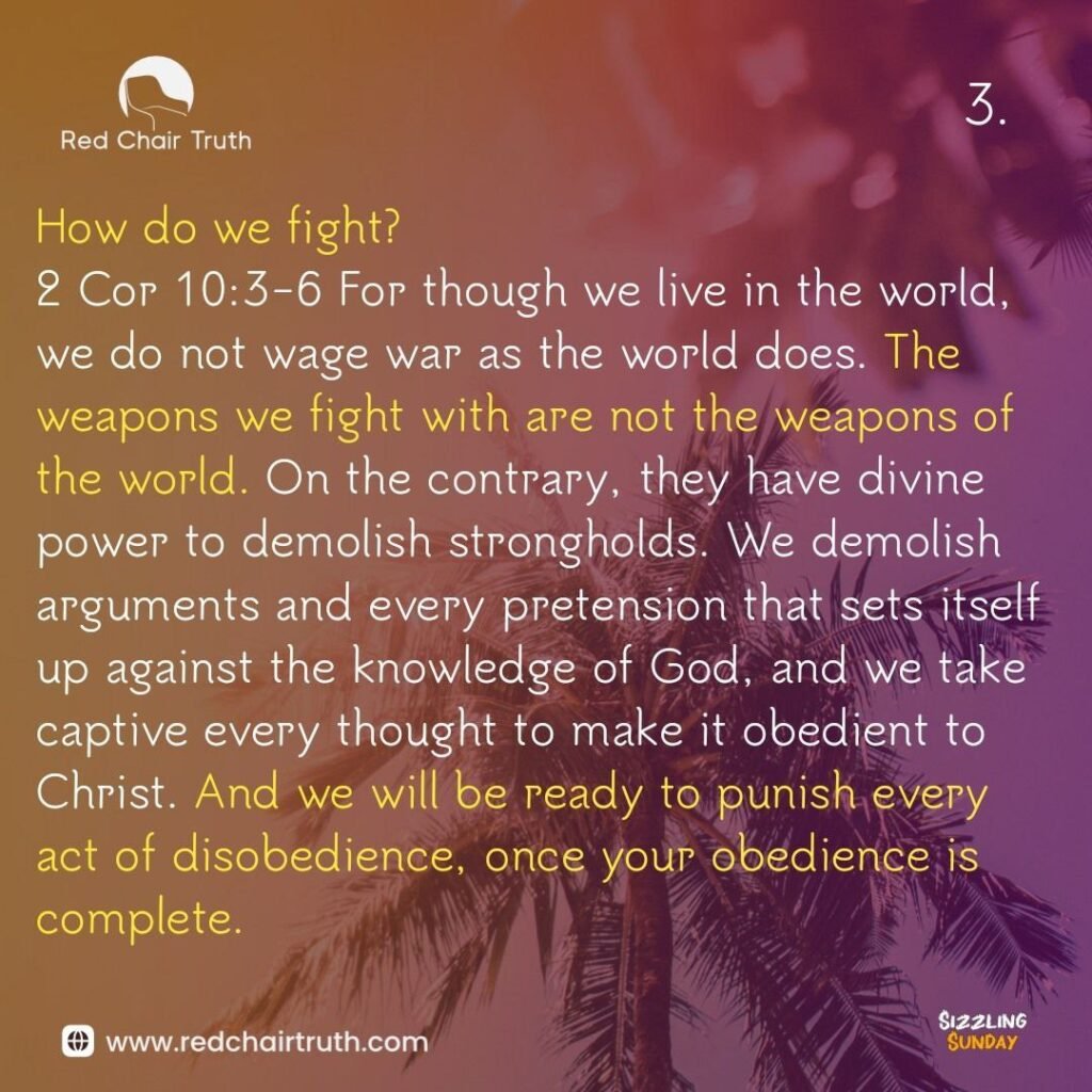 2 Cor 10:3-6 For though we live in the world, we do not wage war as the world does. The weapons we fight with are not the weapons of the world. On the contrary, they have divine power to demolish strongholds. We demolish arguments and every pretension that sets itself up against the knowledge of God, and we take captive every thought to make it obedient to Christ. And we will be ready to punish every act of disobedience, once your obedience is complete.