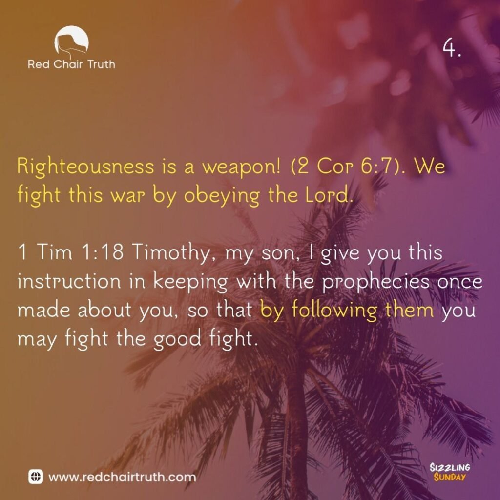 Righteousness is a weapon! (2 Cor 6:7). We fight this war by obeying the Lord.