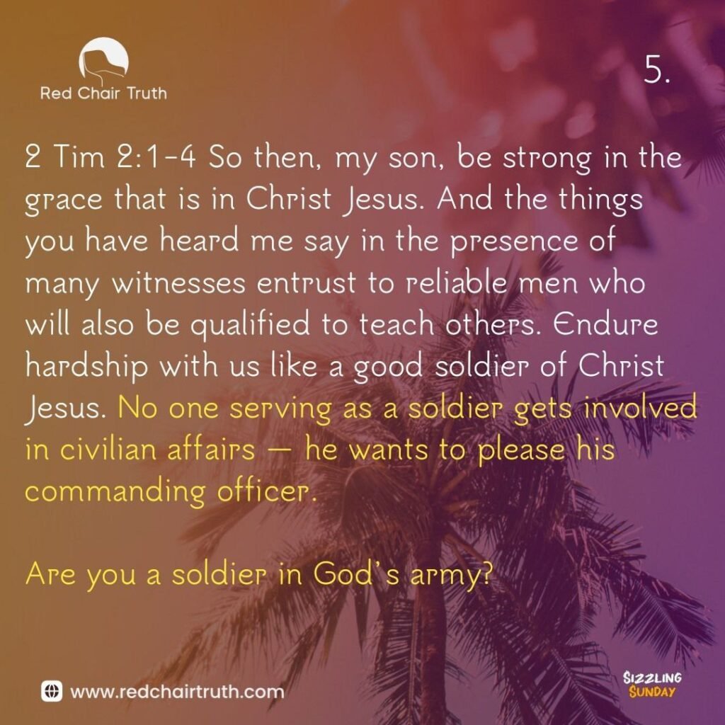 So then, my son, be strong in the grace that is in Christ Jesus. And the things you have heard me say in the presence of many witnesses entrust to reliable men who will also be qualified to teach others. Endure hardship with us like a good soldier of Christ Jesus. No one serving as a soldier gets involved in civilian affairs – he wants to please his commanding officer.