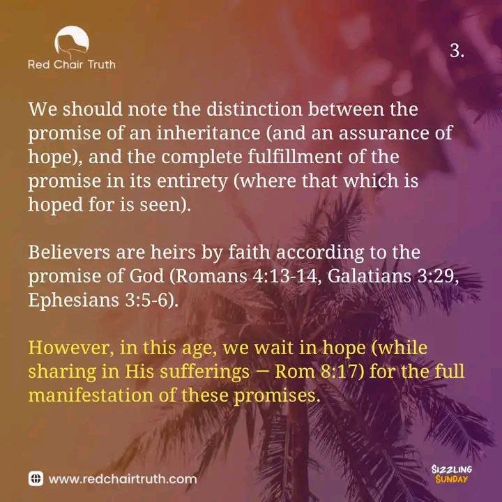 We should note the distinction between the promise of an inheritance (and an assurance of hope), and the complete fulfillment of the promise in its entirety (where that which is hoped for is seen).