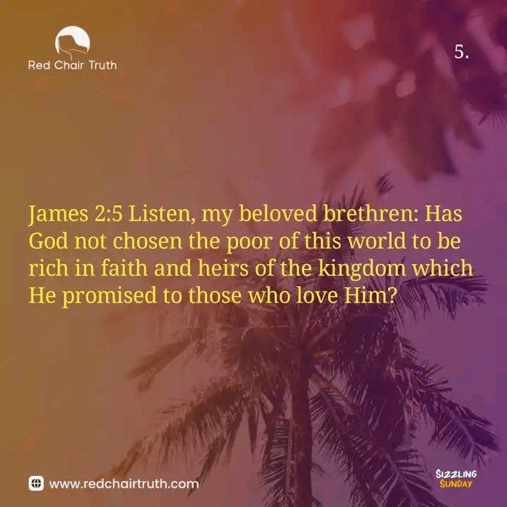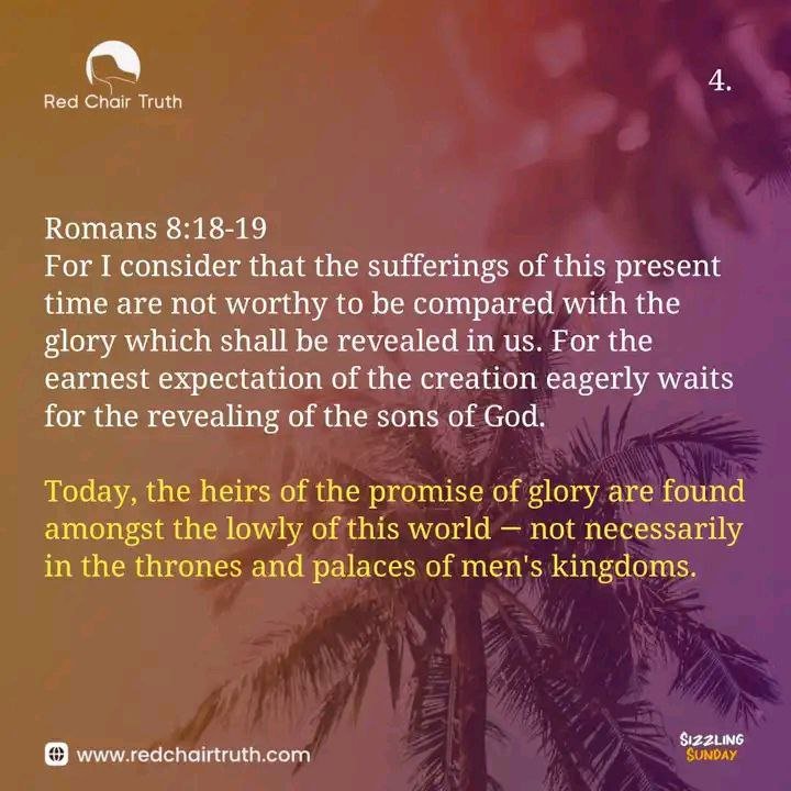 Today, the heirs of the promise of glory are found amongst the lowly of this world – not necessarily in the thrones and palaces of men’s kingdoms. James 2:5 Listen, my beloved brethren: Has God not chosen the poor of this world to be rich in faith and heirs of the kingdom which He promised to those who love Him?