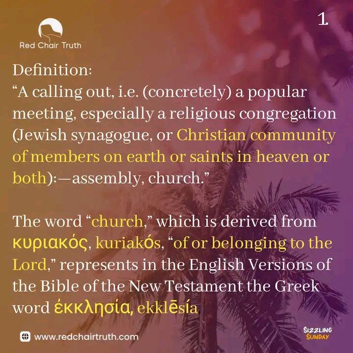 “A calling out, i.e. (concretely) a popular meeting, especially a religious congregation (Jewish synagogue, or Christian community of members on earth or saints in heaven or both):—assembly, church.”