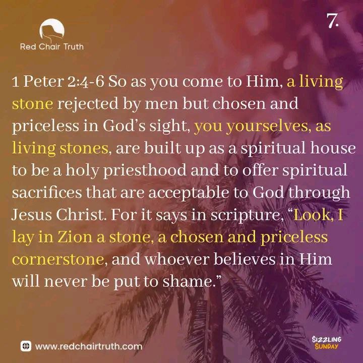 So as you come to Him, a living stone rejected by men but chosen and priceless in God’s sight, you yourselves, as living stones, are built up as a spiritual house to be a holy priesthood and to offer spiritual sacrifices that are acceptable to God through Jesus Christ. For it says in scripture, “Look, I lay in Zion a stone, a chosen and priceless cornerstone, and whoever believes in Him will never be put to shame.”