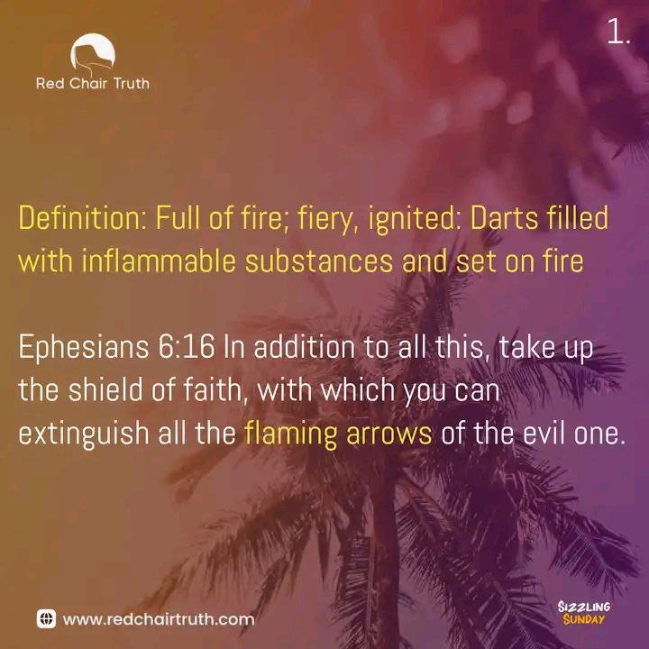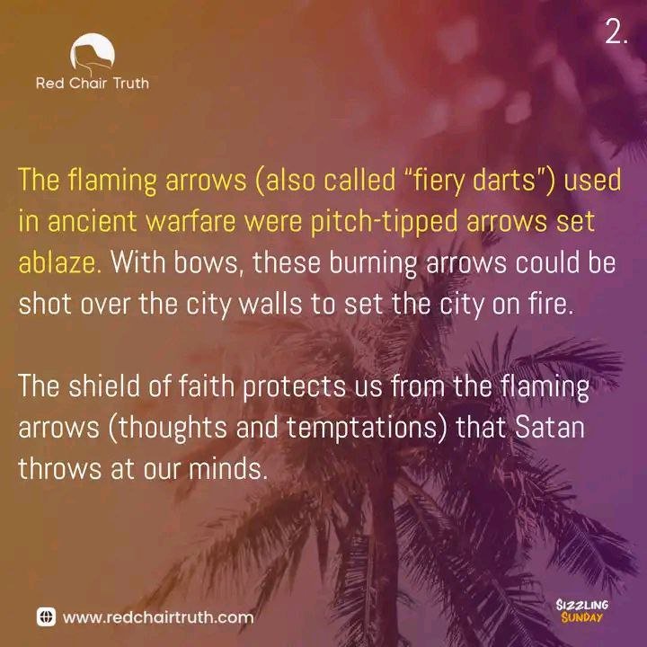 The flaming arrows (also called “fiery darts”) used in ancient warfare were pitch-tipped arrows set ablaze. With bows, these burning arrows could be shot over the city walls to set the city on fire. The shield of faith protects us from the flaming arrows (thoughts and temptations) that Satan throws at our minds.