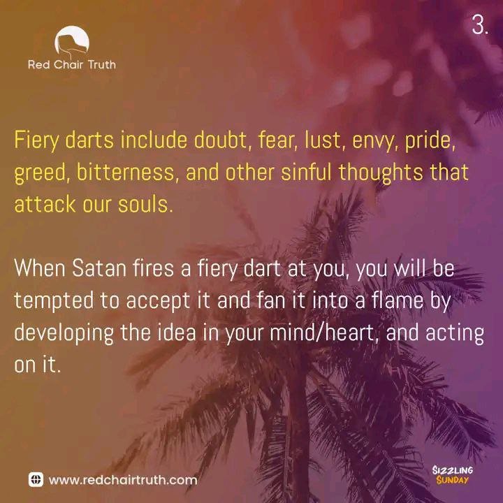 Fiery darts include doubt, fear, lust, envy, pride, greed, bitterness, and other sinful thoughts that attack our souls.