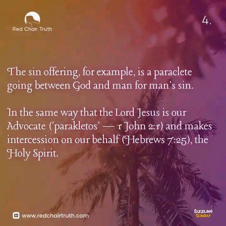 “The works of benevolence and mercy done by the people of Israel in this world become agents of peace and intercessors (paracletes) between them and their Father in heaven.” The sin offering, for example, is a paraclete going between God and man for man’s sin. In the same way that the Lord Jesus is our Advocate (‘parakletos’ — 1 John 2:1) and makes intercession on our behalf (Hebrews 7:25), the Holy Spirit.