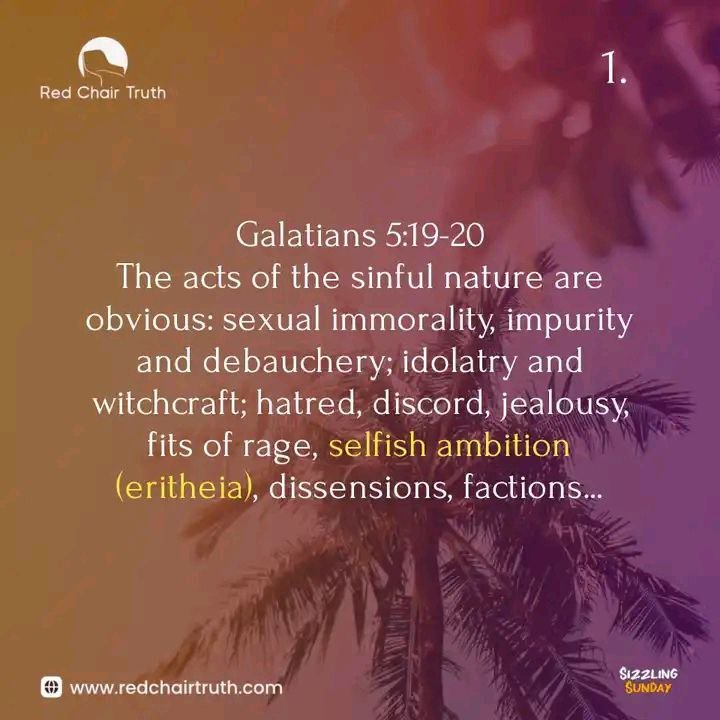 "The acts of the sinful nature are obvious: sexual immorality, impurity and debauchery; idolatry and witchcraft; hatred, discord, jealousy, fits of rage, selfish ambition (eritheia), dissensions, factions…" Galatians 5:19-20