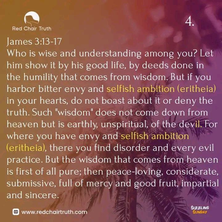 Who is wise and understanding among you? Let him show it by his good life, by deeds done in the humility that comes from wisdom. But if you harbor bitter envy and selfish ambition (eritheia) in your hearts, do not boast about it or deny the truth. Such “wisdom” does not come down from heaven but is earthly, unspiritual, of the devil. For where you have envy and selfish ambition (eritheia), there you find disorder and every evil practice. But the wisdom that comes from heaven is first of all pure; then peace-loving, considerate, submissive, full of mercy and good fruit, impartial and sincere.