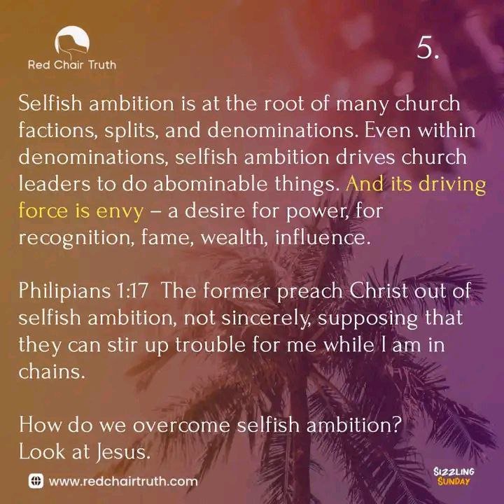 Selfish ambition is at the root of many church factions, splits, and denominations. Even within denominations, selfish ambition drives church leaders to do abominable things. And its driving force is envy – a desire for power, for recognition, fame, wealth, influence.