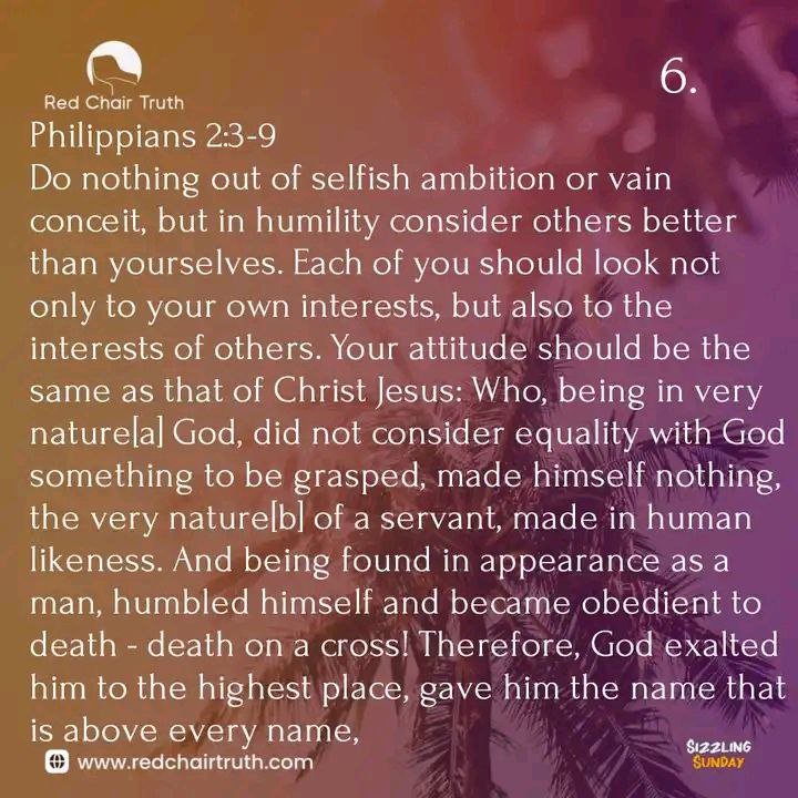 Do nothing out of selfish ambition or vain conceit, but in humility consider others better than yourselves. Each of you should look not only to your own interests, but also to the interests of others. Your attitude should be the same as that of Christ Jesus: Who, being in very nature[a] God, did not consider equality with God something to be grasped, made himself nothing, the very nature[b] of a servant, made in human likeness. And being found in appearance as a man, humbled himself and became obedient to death – death on a cross! Therefore, God exalted him to the highest place, gave him the name that is above every name,