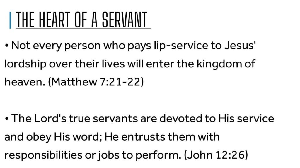 • The Lord’s true servants are devoted to His service and obey His word; He entrusts them with responsibilities or jobs to perform. (John 12:26)