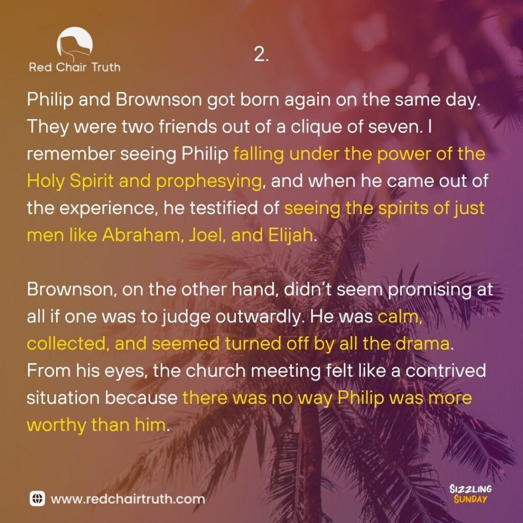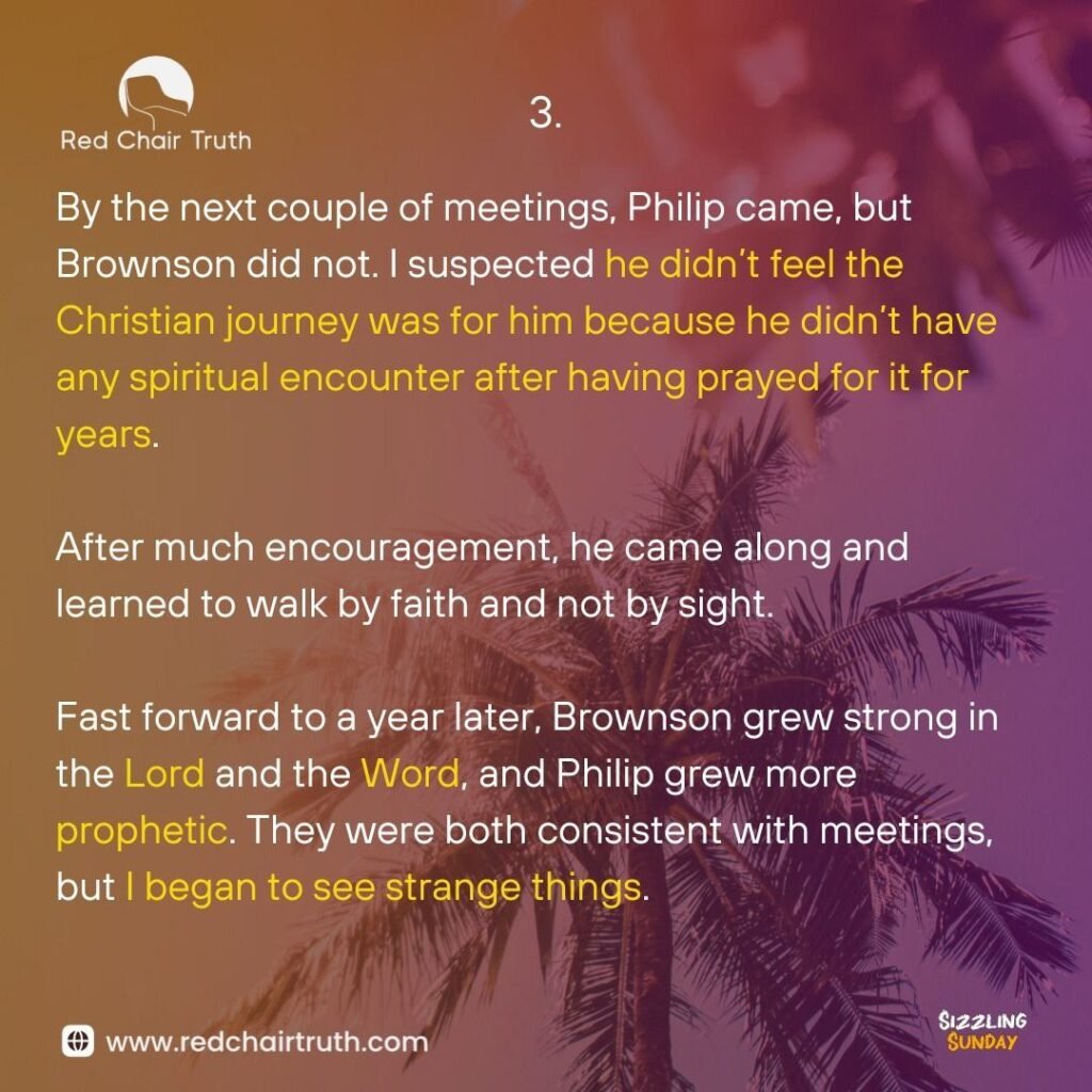 Fast forward to a year later, Brownson grew strong in the Lord and the Word, and Philip grew more prophetic. They were both consistent with meetings, but I began to see strange things.