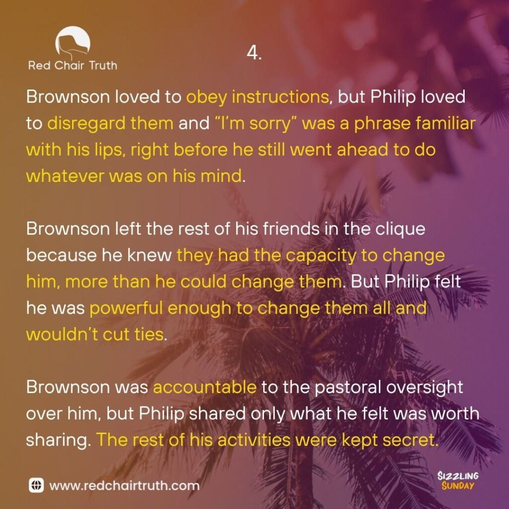 Brownson left the rest of his friends in the clique because he knew they had the capacity to change him, more than he could change them. But Philip felt he was powerful enough to change them all and wouldn’t cut ties.