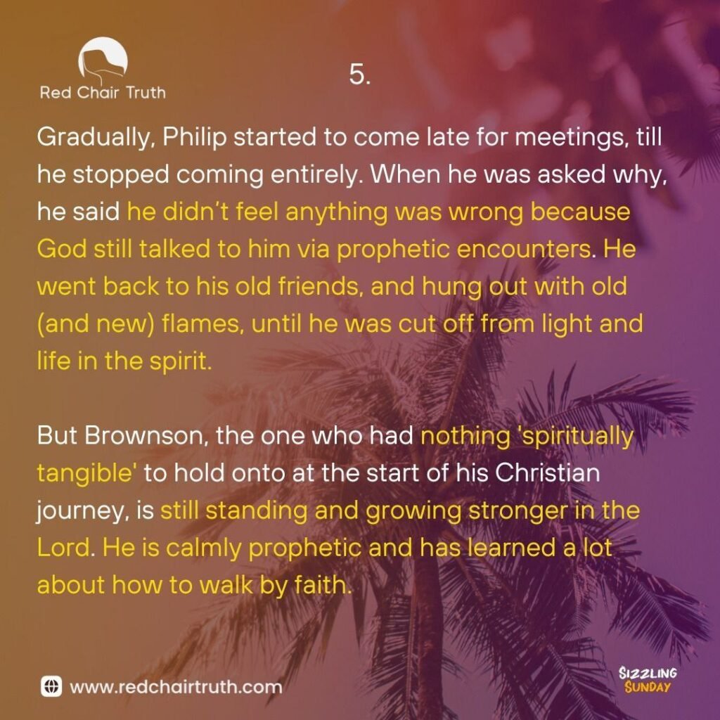 Gradually, Philip started to come late for meetings, till he stopped coming entirely. When he was asked why, he said he didn’t feel anything was wrong because God still talked to him via prophetic encounters. He went back to his old friends, and hung out with old (and new) flames, until he was cut off from light and life in the spirit.
