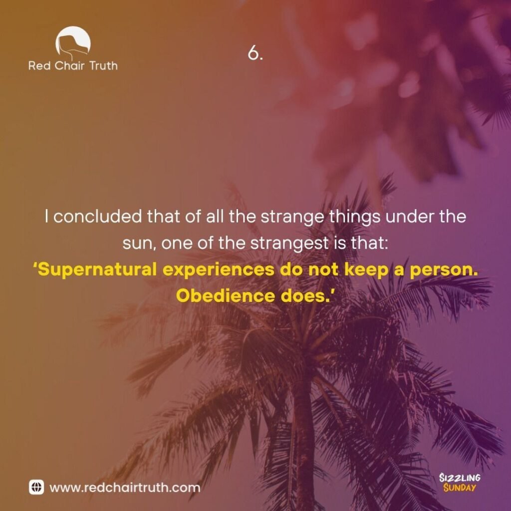 I concluded that of all the strange things under the sun, one of the strangest is that: ‘Supernatural experiences do not keep a person. Obedience does.’