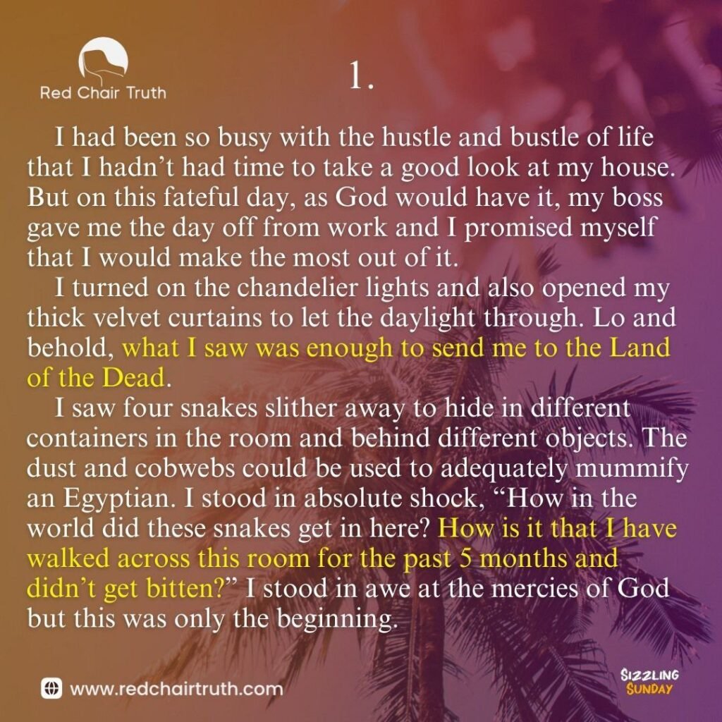 I saw four snakes slither away to hide in different containers in the room and behind different objects. The dust and cobwebs could be used to adequately mummify an Egyptian. I stood in absolute shock, “How in the world did these snakes get in here? How is it that I have walked across this room for the past 5 months and didn’t get bitten?” I stood in awe at the mercies of God but this was only the beginning.