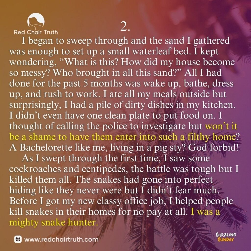 As I swept through the first time, I saw some cockroaches and centipedes, the battle was tough but I killed them all. The snakes had gone into perfect hiding like they never were but I didn’t fear much. Before I got my new classy office job, I helped people kill snakes in their homes for no pay at all. I was a mighty snake hunter.