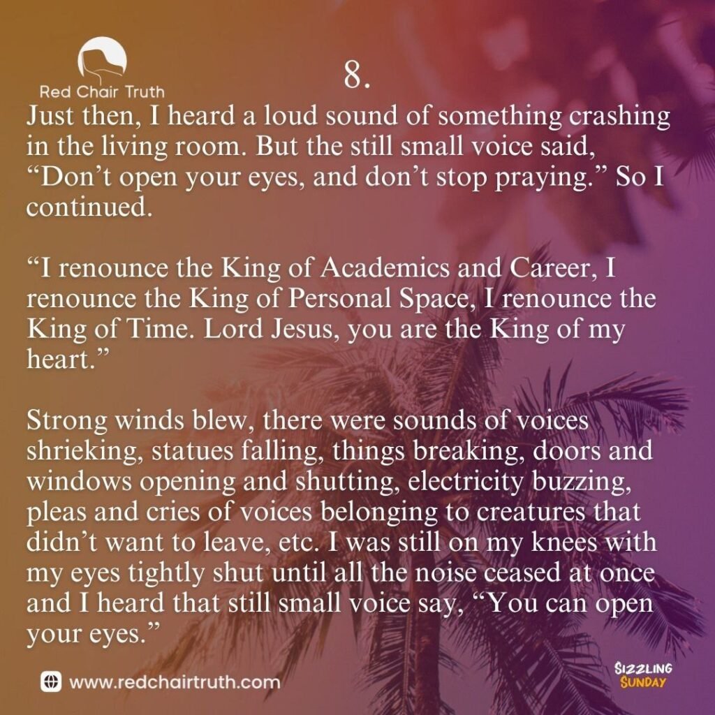 Strong winds blew, there were sounds of voices shrieking, statues falling, things breaking, doors and windows opening and shutting, electricity buzzing, pleas and cries of voices belonging to creatures that didn’t want to leave, etc. I was still on my knees with my eyes tightly shut until all the noise ceased at once and I heard that still small voice say, “You can open your eyes.”
