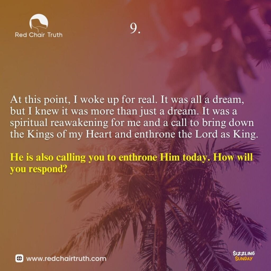 At this point, I woke up for real. It was all a dream, but I knew it was more than just a dream. It was a spiritual reawakening for me and a call to bring down the Kings of my Heart and enthrone the Lord as King.