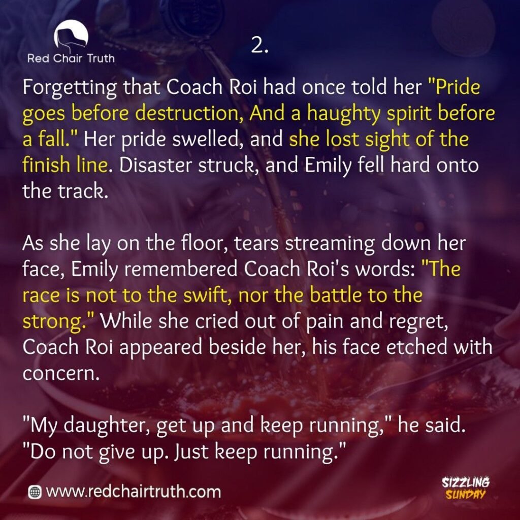Forgetting that Coach Roi had once told her “Pride goes before destruction, And a haughty spirit before a fall.” Her pride swelled, and she lost sight of the finish line. Disaster struck, and Emily fell hard onto the track.