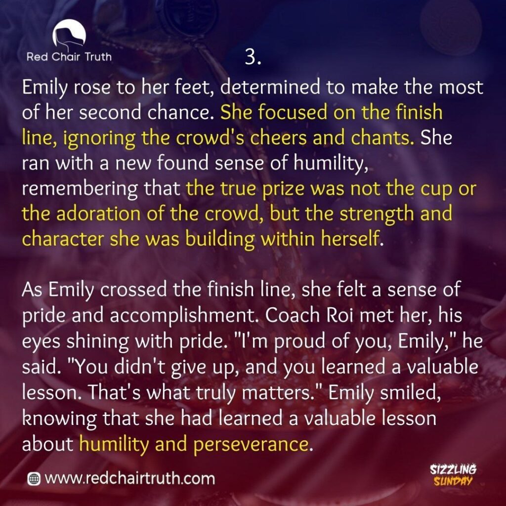 Emily rose to her feet, determined to make the most of her second chance. She focused on the finish line, ignoring the crowd’s cheers and chants. She ran with a new found sense of humility, remembering that the true prize was not the cup or the adoration of the crowd, but the strength and character she was building within herself.