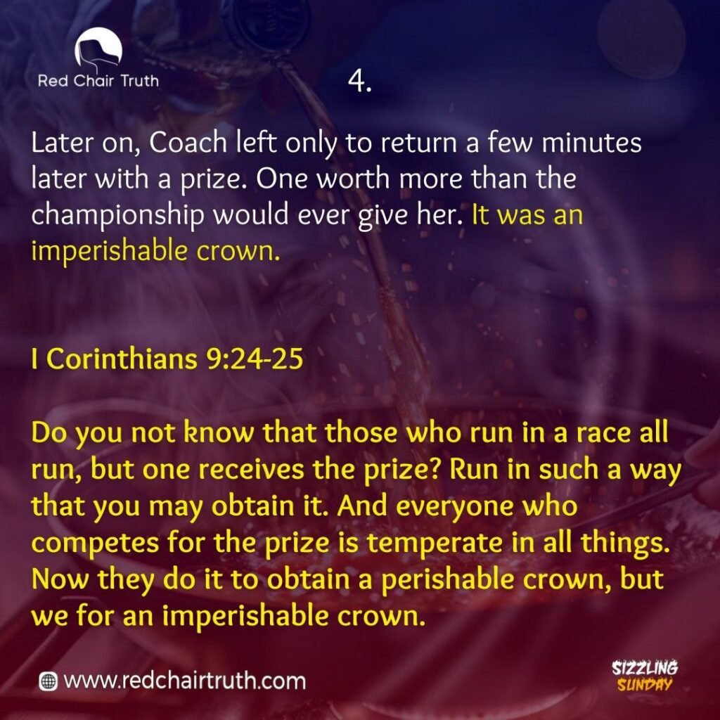 Later on, Coach left only to return a few minutes later with a prize. One worth more than the championship would ever give her. It was an imperishable crown.