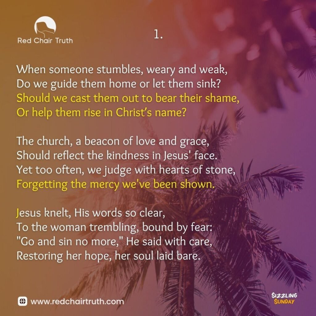 To the woman trembling, bound by fear: “Go and sin no more,” He said with care, Restoring her hope, her soul laid bare.