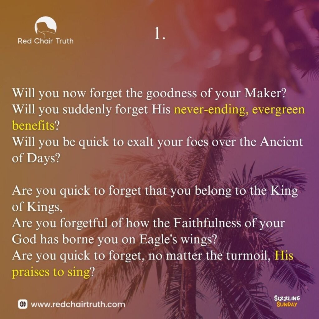 Will you suddenly forget His never-ending, evergreen benefits?