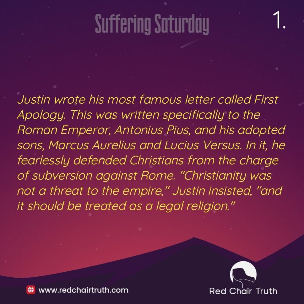 Justin wrote his most famous letter called First Apology. This was written specifically to the Roman Emperor, Antonius Pius, and his adopted sons, Marcus Aurelius and Lucius Versus. In it, he fearlessly defended Christians from the charge of subversion against Rome. “Christianity was not a threat to the empire,” Justin insisted, “and it should be treated as a legal religion.” Justin was adamant: “Christians should not be persecuted just for being Christians, and they also would not compromise their beliefs. Jesus’ followers,” he told the emperor, “had been transformed from children of darkness to children of light. Therefore, they would no longer worship pagan gods (demons in disguise) or live as sinners.” Justin concluded his First Apology, or defense, by eloquently and rationally requesting that the emperor no longer persecute the Christian believers living throughout his empire.