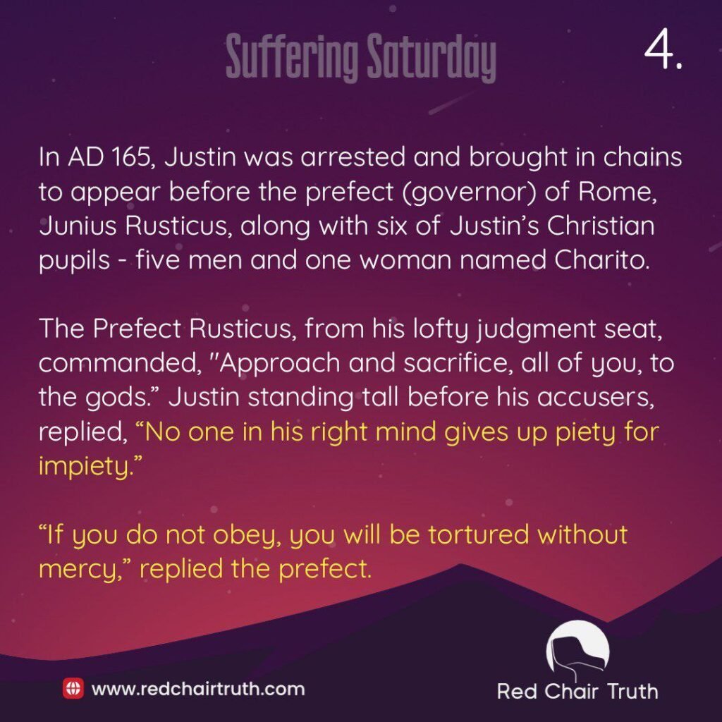 In AD 165, Justin was arrested and brought in chains to appear before the prefect (governor) of Rome, Junius Rusticus, along with six of Justin’s Christian pupils – five men and one woman named Charito. The Prefect Rusticus, from his lofty judgment seat, commanded, “Approach and sacrifice, all of you, to the gods.” Justin standing tall before his accusers, replied, “No one in his right mind gives up piety for impiety.” “If you do not obey, you will be tortured without mercy,” replied the prefect. “Do as you wish,” Justin and the martyrs standing beside him responded, “for we are Christians, and we do not sacrifice to idols.”